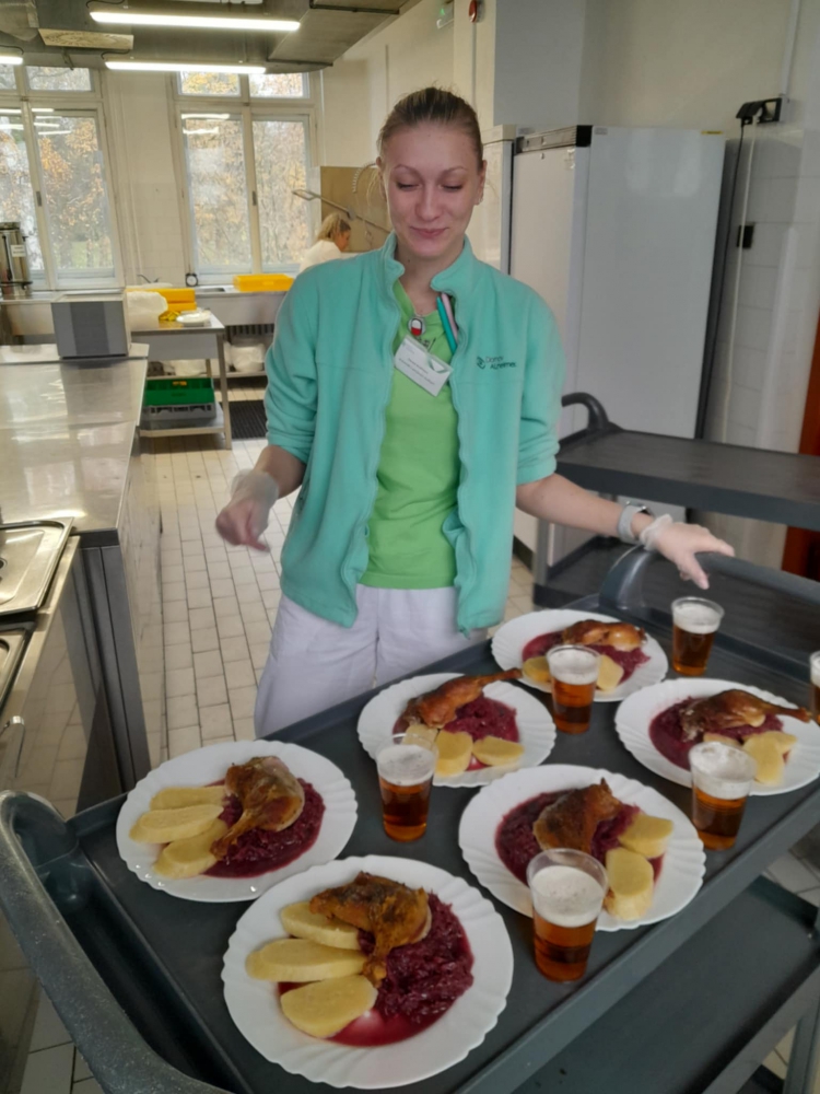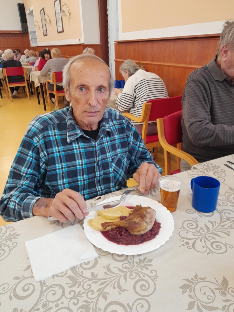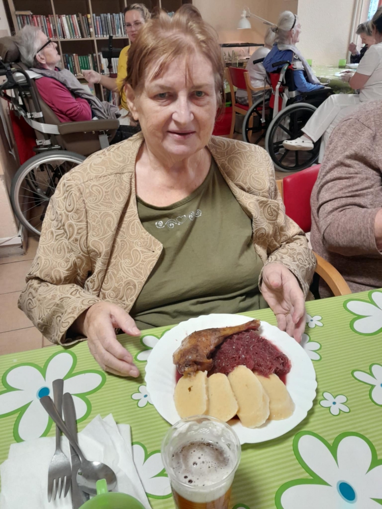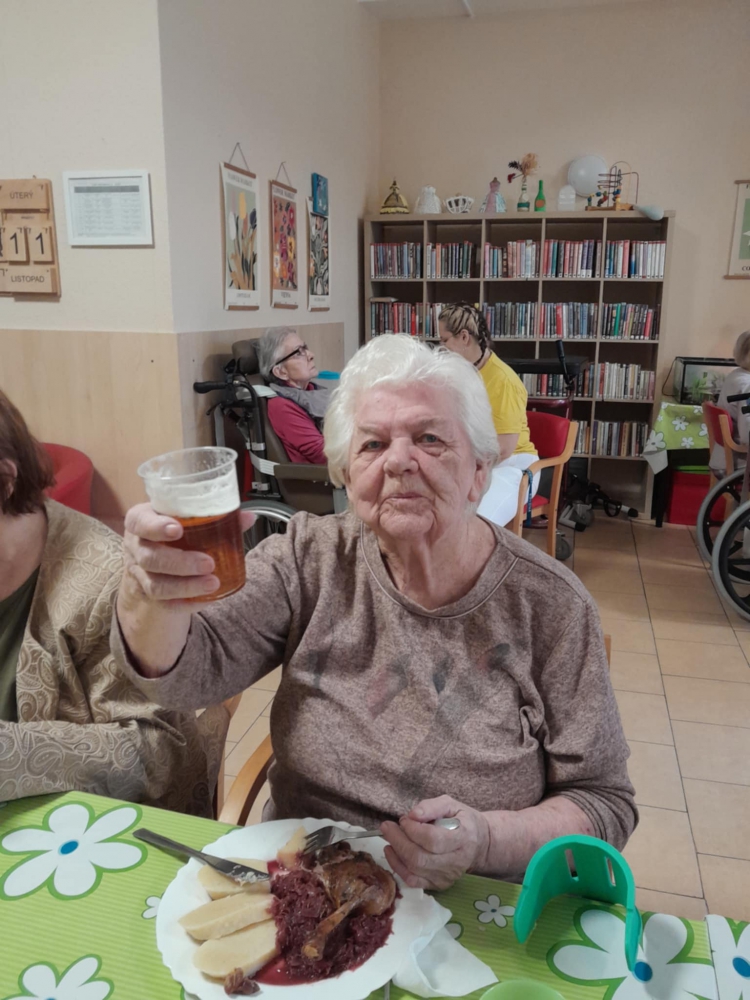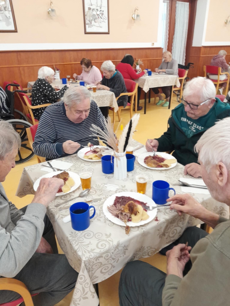 Dnes jsme si opravdu pochutnali! Naši kuchaři připravili výtečný svatomartinský oběd – nechyběla křehká kačení pečínka, červené zelí, výborný bramborový knedlík, závin z kynutého těsta s jablíčky a samozřejmě i sklenka piva. Klientům i zaměstnancům jsme s láskou popřáli dobrou chuť.