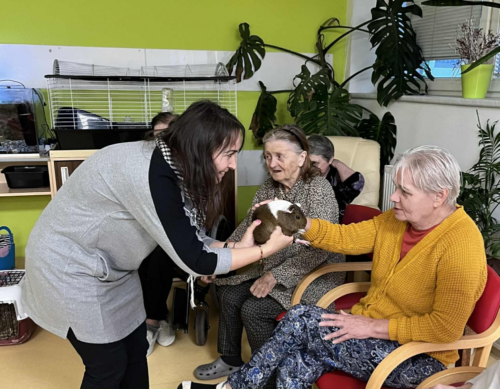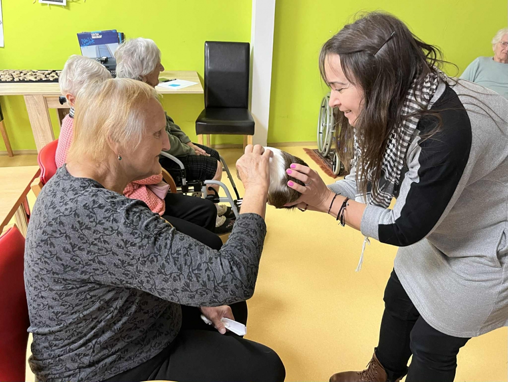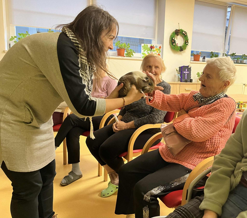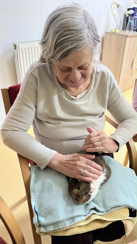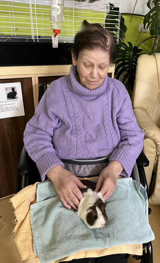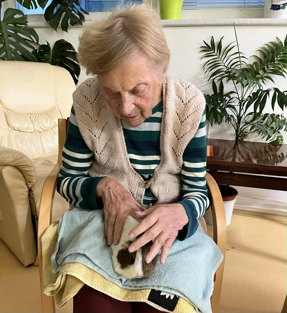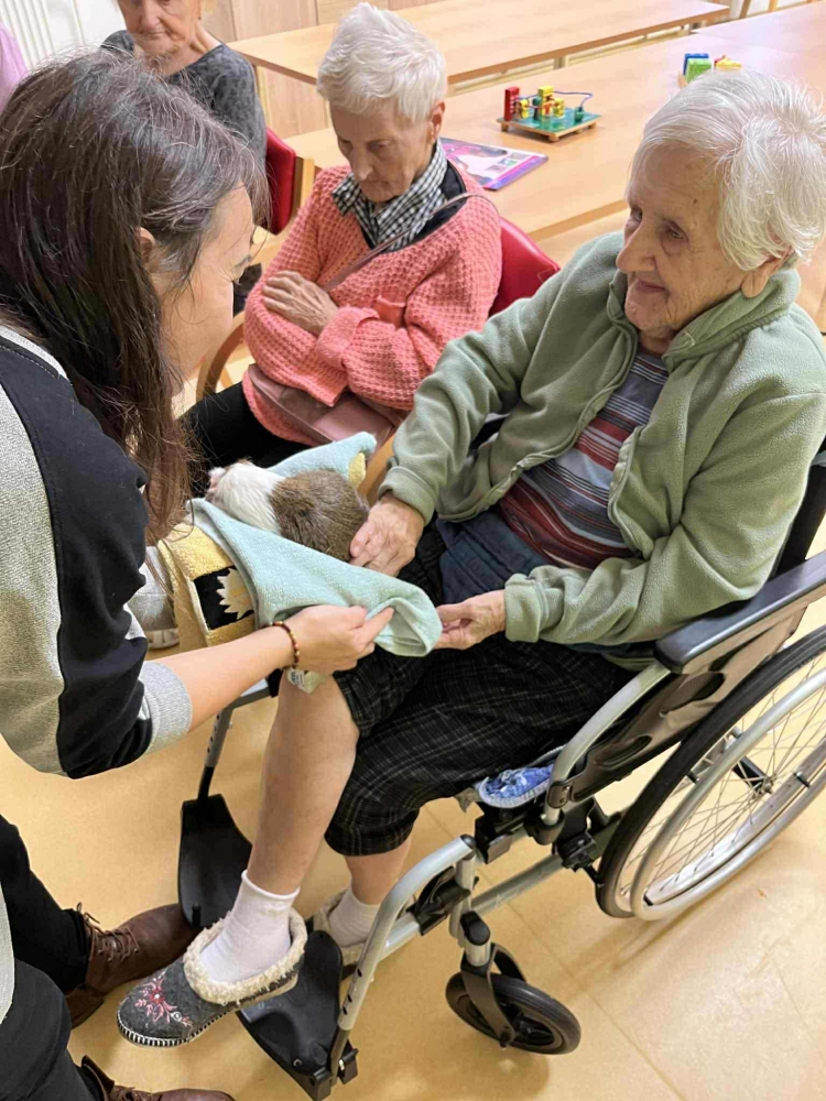 Do našeho Domova zavítala certifikovaná terapeutka, která mezi nás přivedla svá roztomilá morčátka. Tato návštěva přinesla spoustu úsměvů, klidu a pohody – morčátka se nechala hladit, mazlit a tiše pobrukovala, což na všechny působilo velmi uklidňujícím dojmem.
