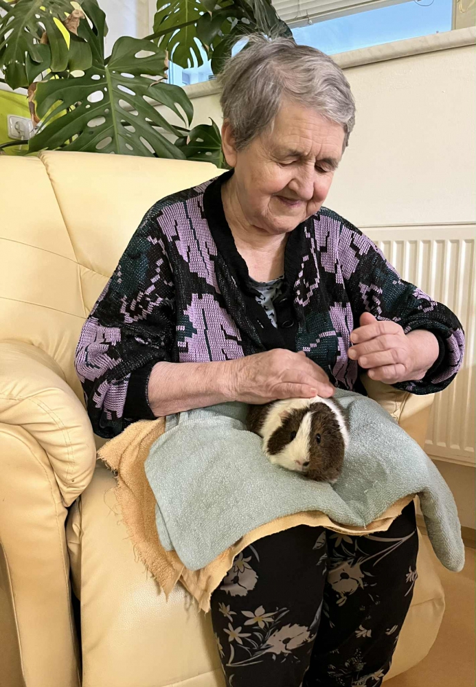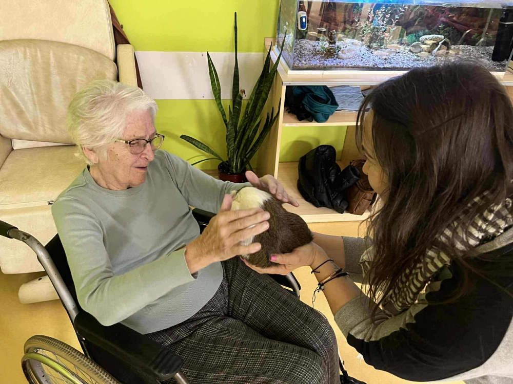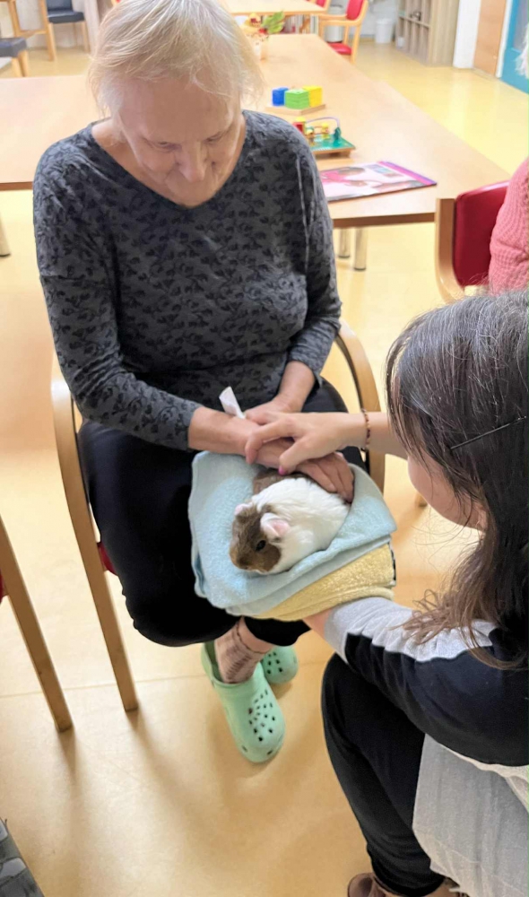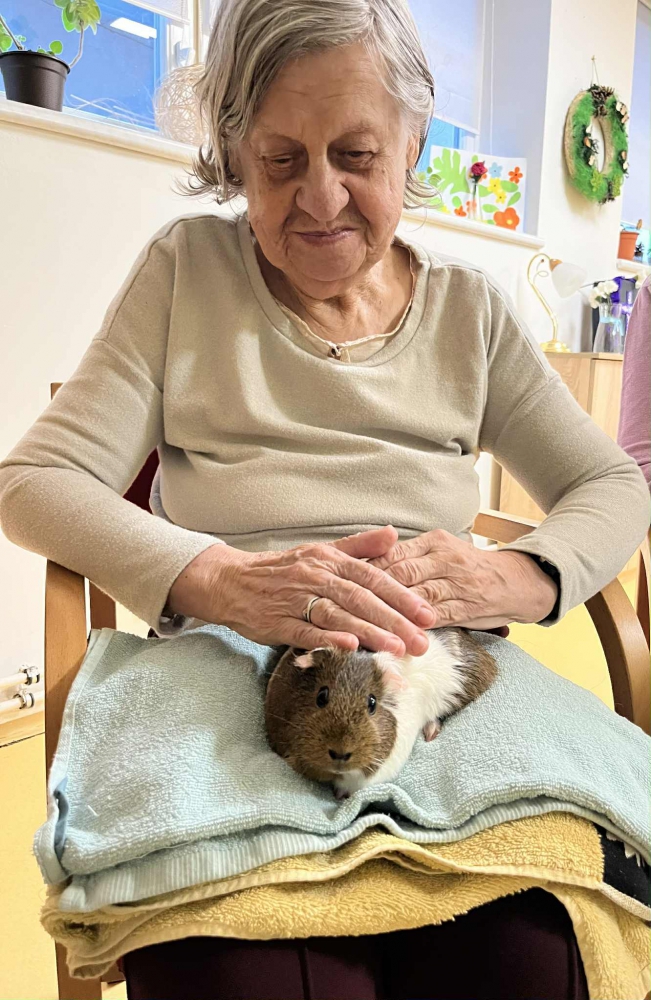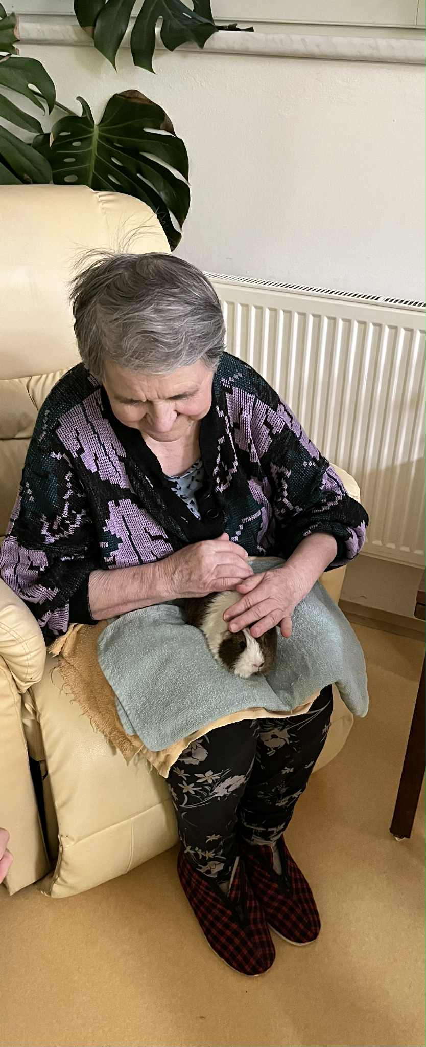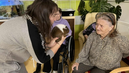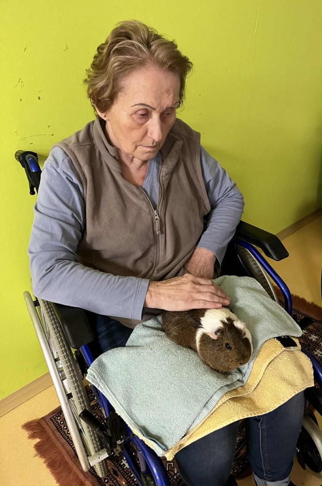 Do našeho Domova zavítala certifikovaná terapeutka, která mezi nás přivedla svá roztomilá morčátka. Tato návštěva přinesla spoustu úsměvů, klidu a pohody – morčátka se nechala hladit, mazlit a tiše pobrukovala, což na všechny působilo velmi uklidňujícím dojmem.