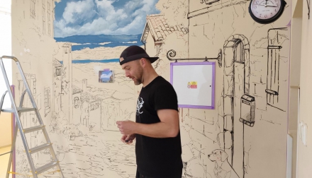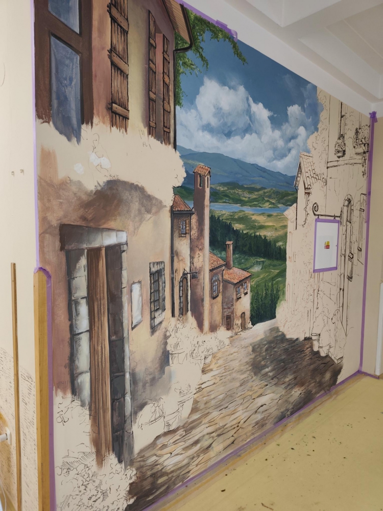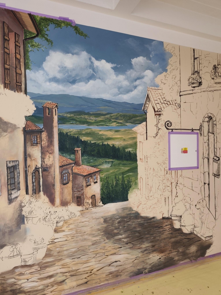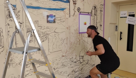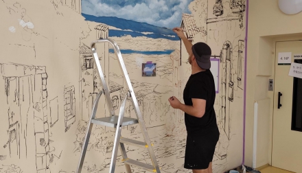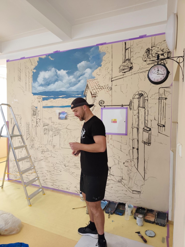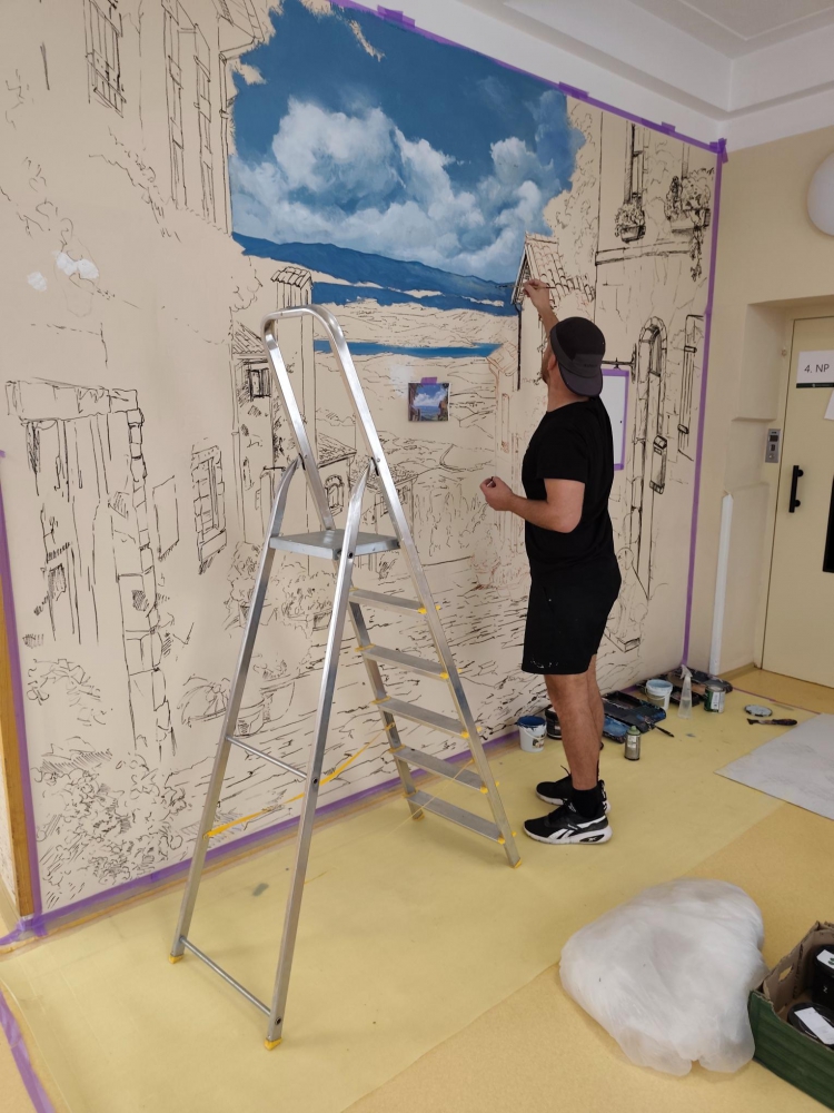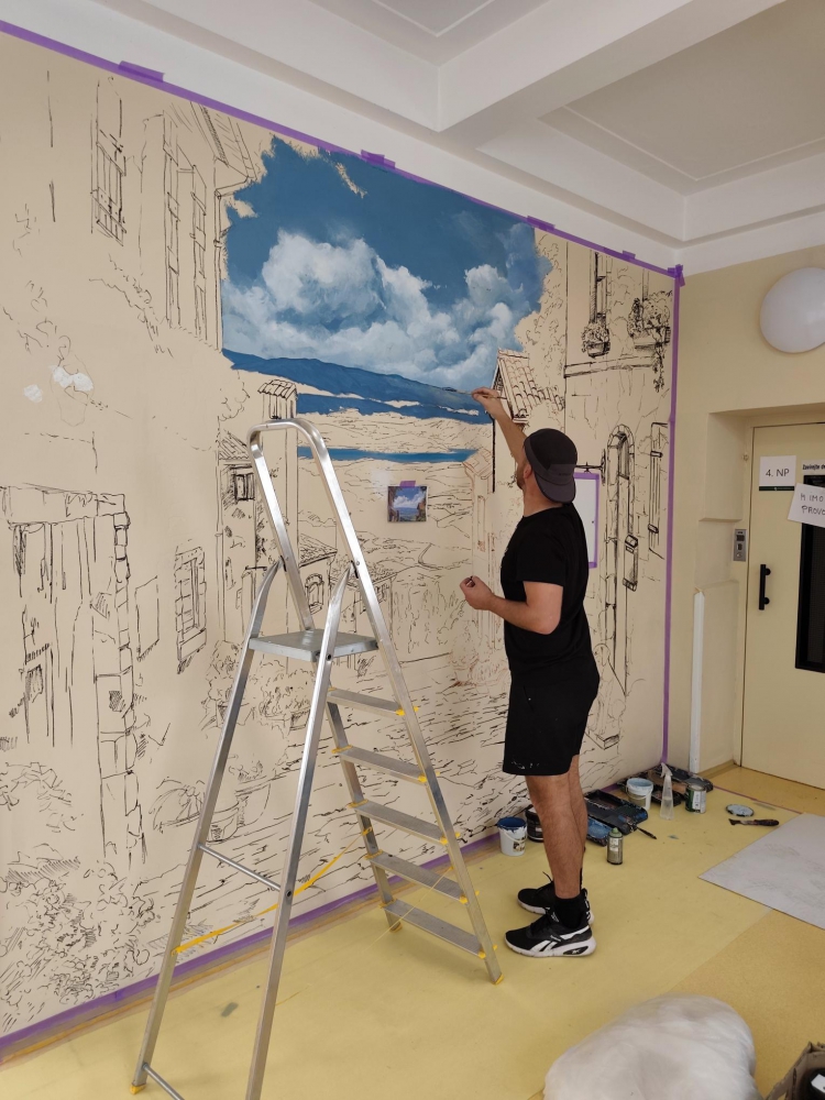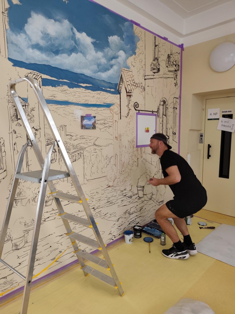 Jedním z kroků, jak tohoto cíle dosáhnout, bylo oslovení umělce KHOMA, který se pustil do tvorby nástěnné malby přímo v prostorách našeho domova. Během několika dní se tak obyčejná zeď postupně proměňovala v jedinečné umělecké dílo, které do interiéru vnáší emoce, harmonii a inspiraci.