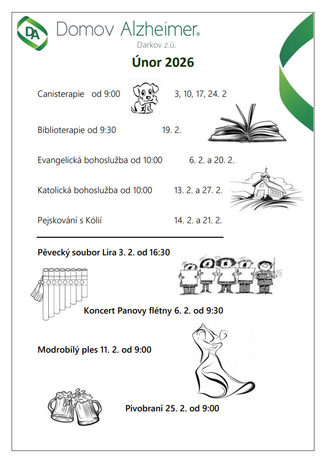 V únoru nás čeká pestrý program plný hudby, setkávání a společných zážitků. Těšit se můžete na přednášky Kulturní dějiny Asie, canisterapii, muzikoterapii, vaření, bohoslužby, koncert panovy flétny, Modrobílý ples, narozeniny klientů i tvořivé a výletní aktivity.