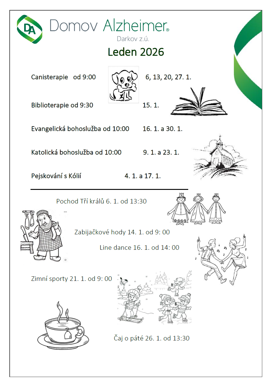 Leden 2026 přináší pestrý program plný setkávání, tradic i aktivního odpočinku. Společně přivítáme nový rok, užijeme si muzikoterapii, canisterapii, vaření i reminiscenční setkání. Čekají nás tematické přednášky, bohoslužby, line dance, zimní sportovní dopoledne, oslavy narozenin klientů i tradiční zabijačkové hody.