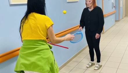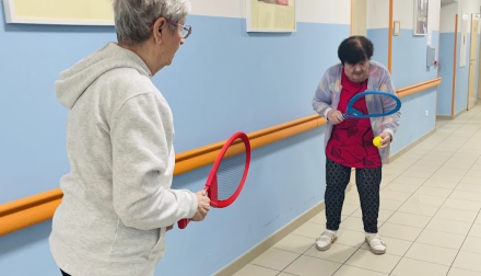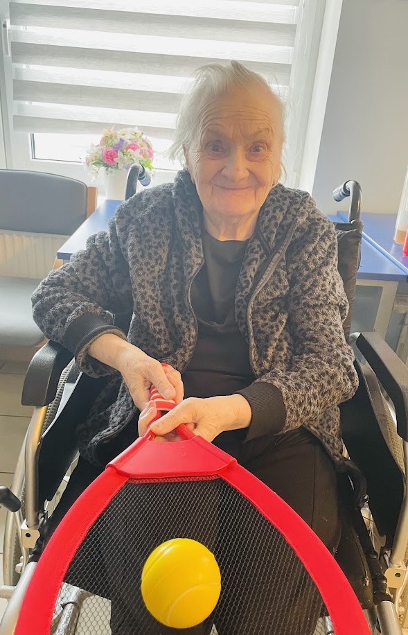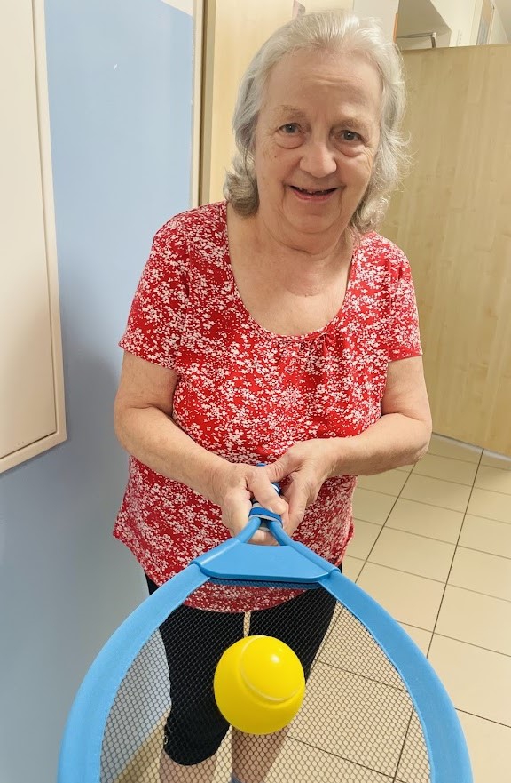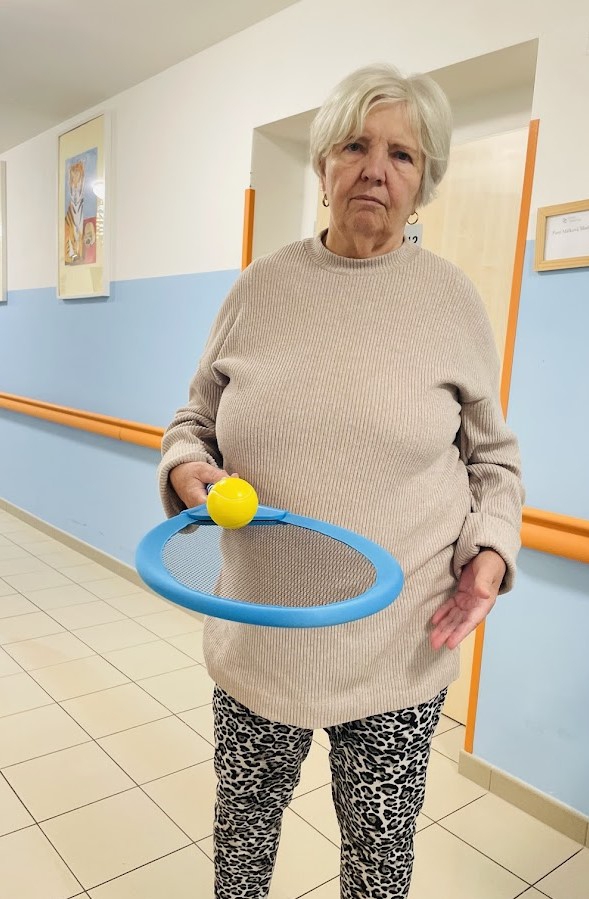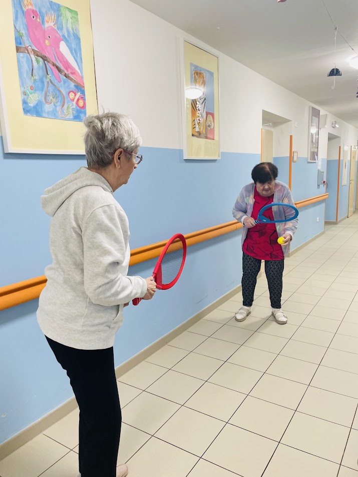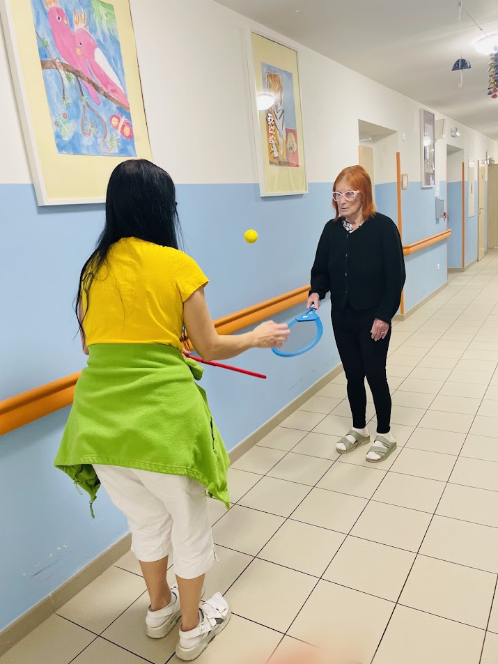 Klienti se soustředili, smáli se a povzbuzovali navzájem. Cvičení podporuje rovnováhu, koordinaci ruky a oka. Někteří klienti si dokonce mezi sebou zkusili zahrát i líný tenis, který do dopoledního programu vnesl ještě více pohybu a smíchu. Takové aktivity posilují tělo i dobrou náladu.