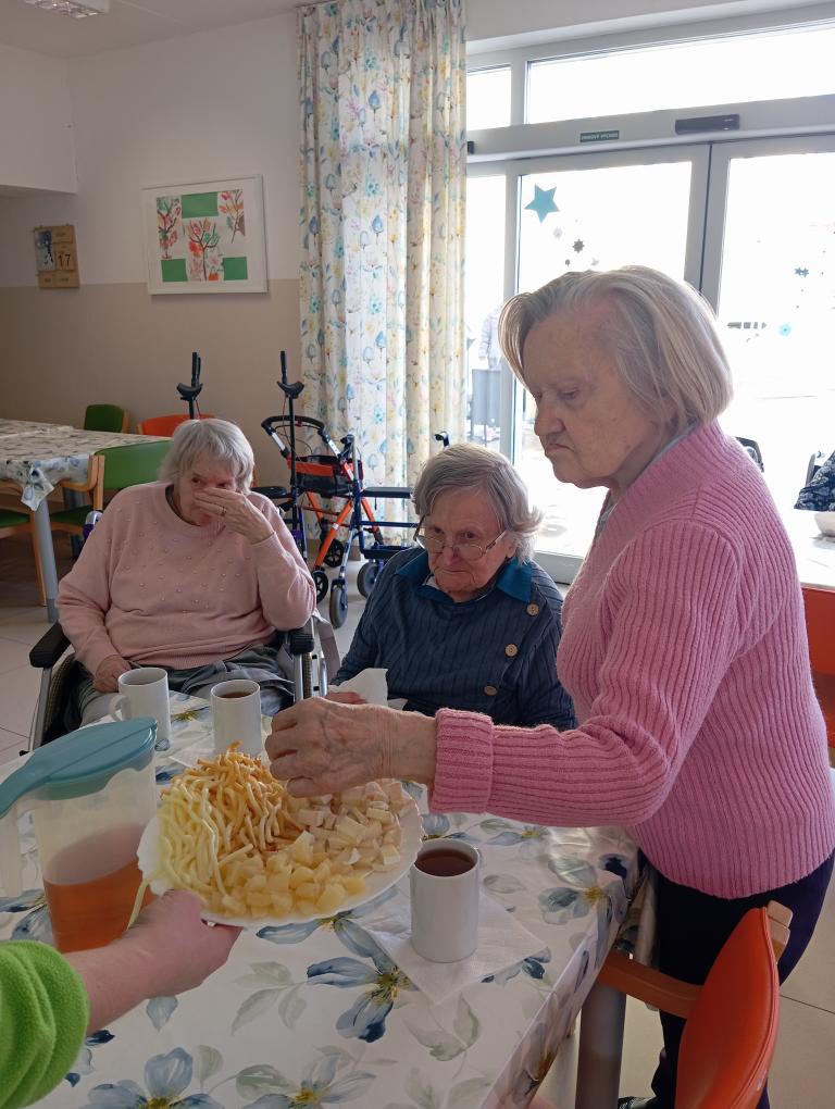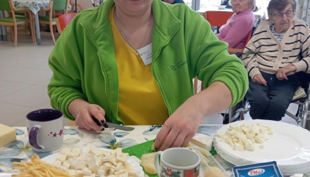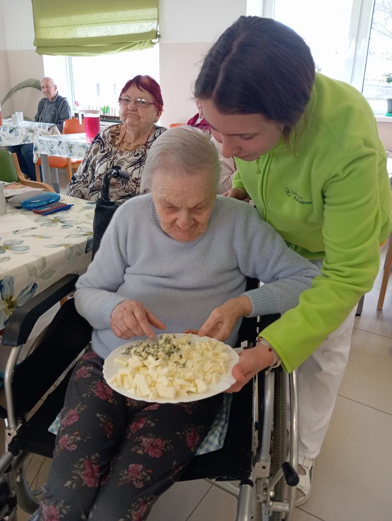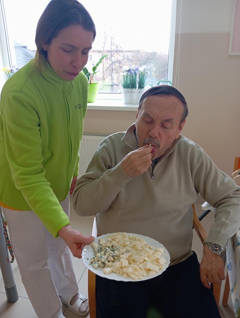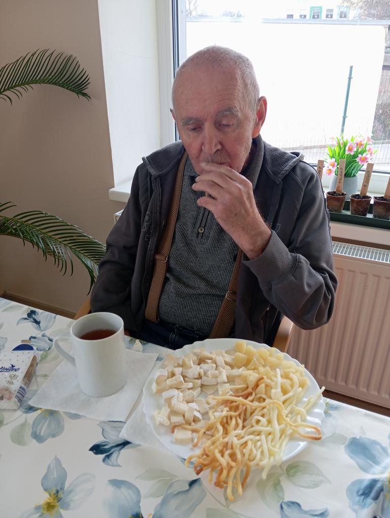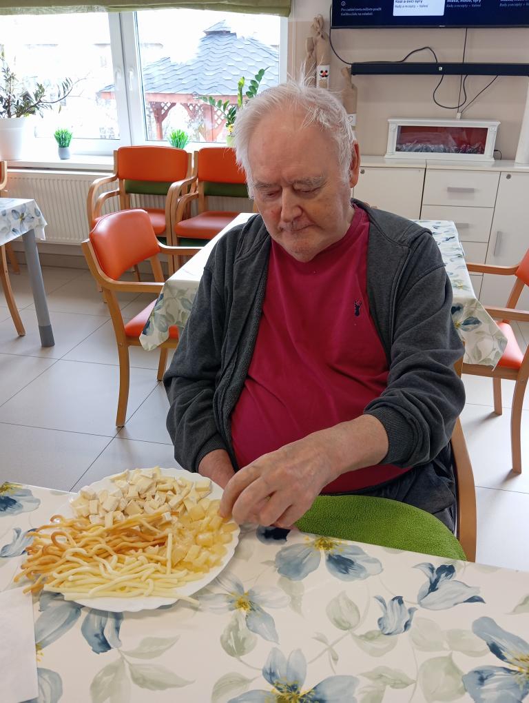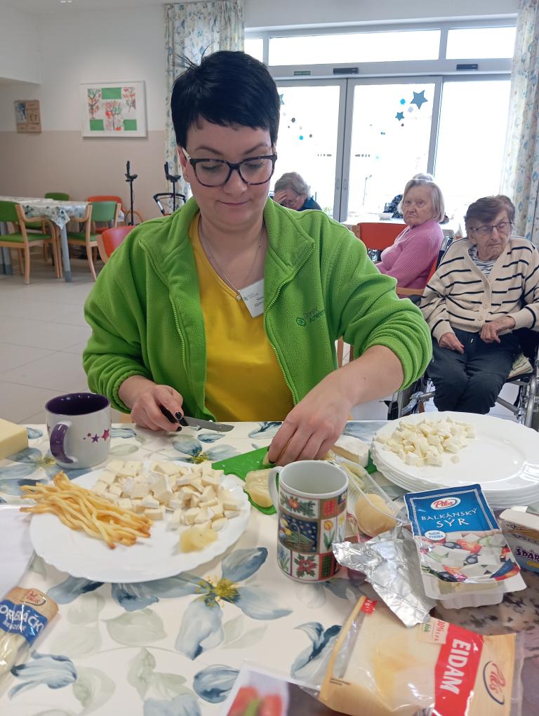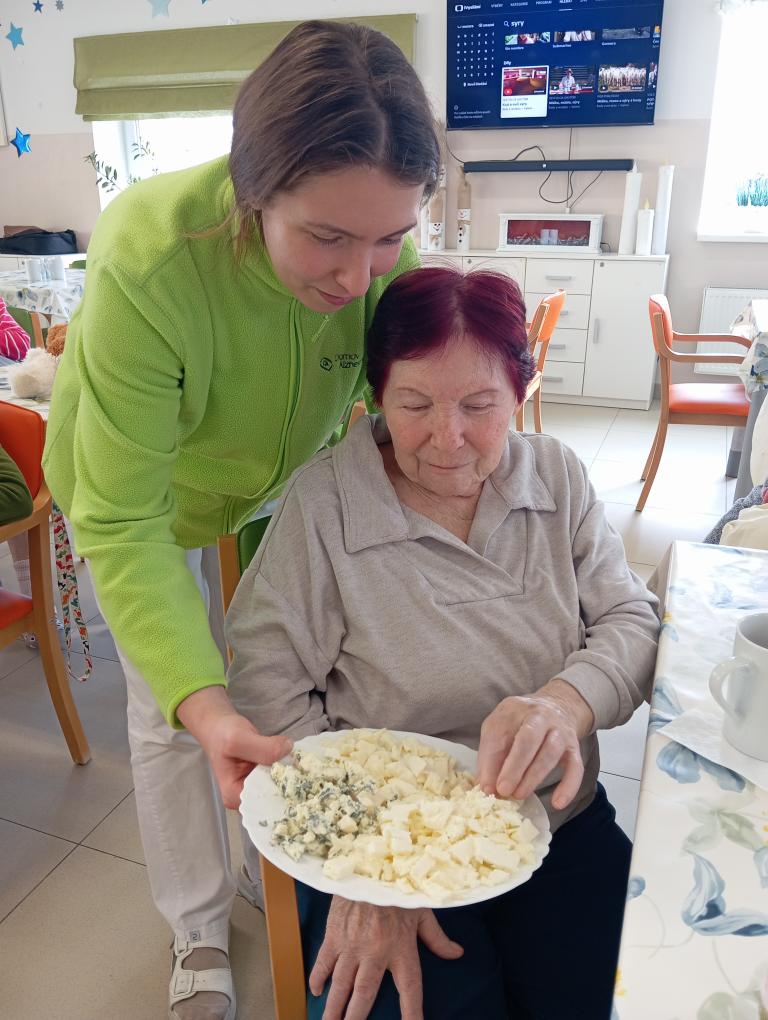 Na středeční aktivizaci jsme se sešli v jídelně, kde jsme si povídali o sýrech, jejich výrobě i zrání a připomněli si rozdíly mezi čerstvými, měkkými, polotvrdými a tvrdými druhy. Zmínili jsme například mmj. - jemnou Mozzarellu, výraznou Nivu i sametový Camembert.