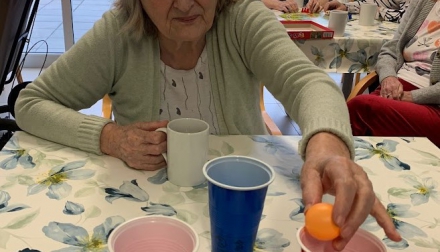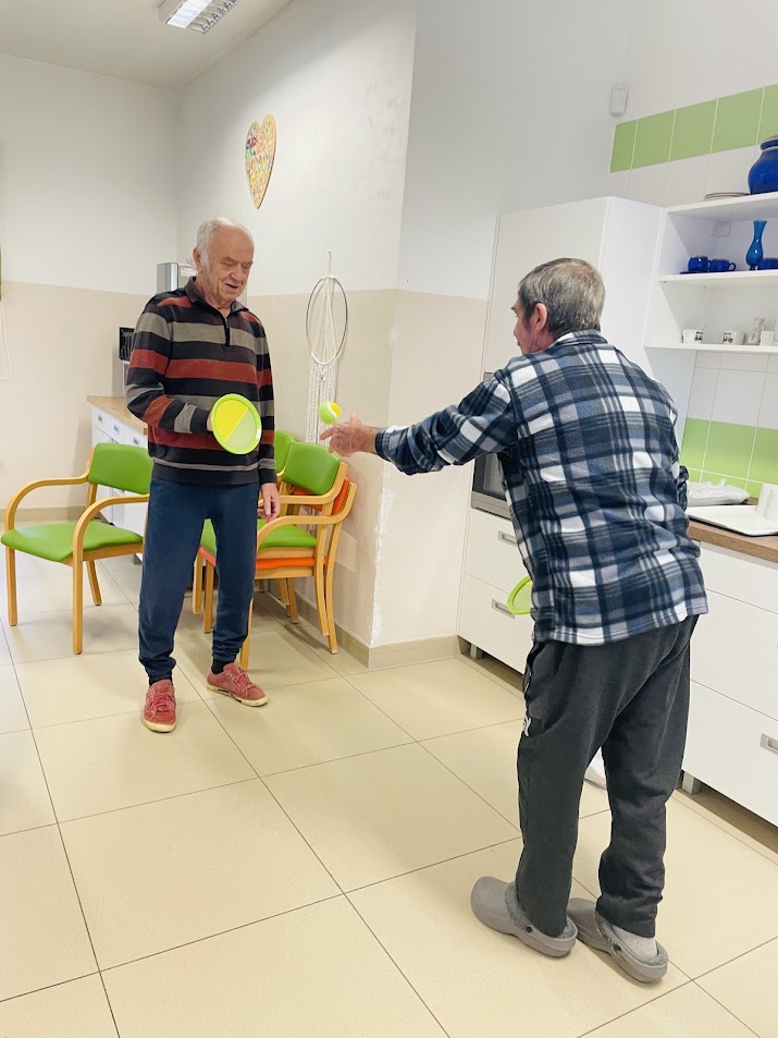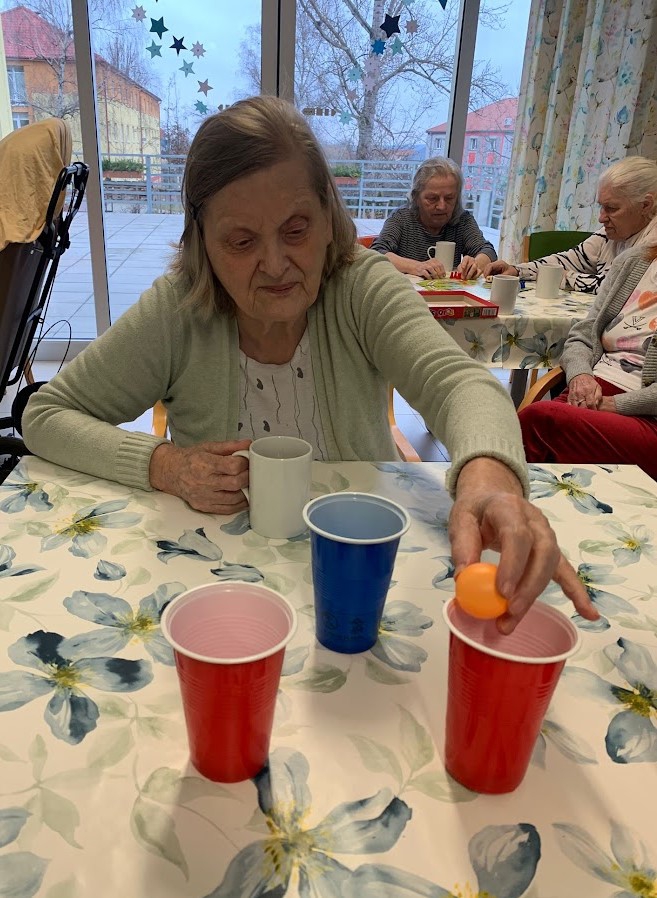 V domově proběhlo příjemné dopoledne plné pohybových a společenských aktivit. Klienti se zapojili do jednoduchých her, které podporují soustředění, koordinaci i radost ze spolupráce. U stolů si klienti vyzkoušeli zábavnou hru s míčky a kelímky, při které trénovali jemnou motoriku a přesnost.