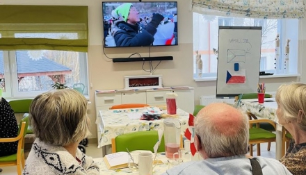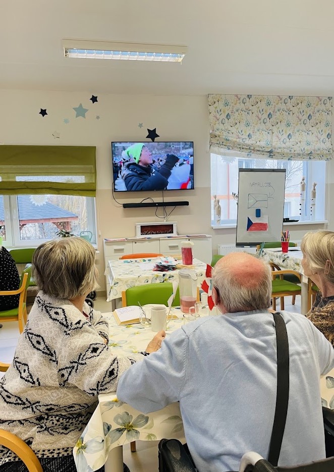 V další části programu proběhla lehká pohybová aktivita, která připomínala tenis a podpořila vzájemnou spolupráci. Někteří se také se zájmem dívali na přímý přenos z olympijských her. Společně strávený čas přinesl radost, aktivní zapojení i hezké sdílené chvíle.