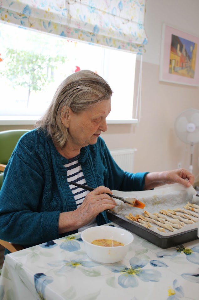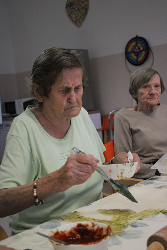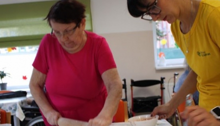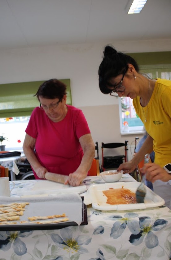 Vůně čerstvě upečeného těsta provoněla celý domov a jak příchozím návštěvám, tak i nám všem vykouzlila úsměvy na tvářích. Pečení bylo příjemnou aktivitou, která klientům připomněla jejich dřívější zkušenosti z domácností a zároveň šlo o přípravu na slavnost Dočesné, která se konala následující den. Celé dopoledne se tak neslo v přátelské náladě, pohodě i spokojenosti z dobře vykonané práce.