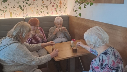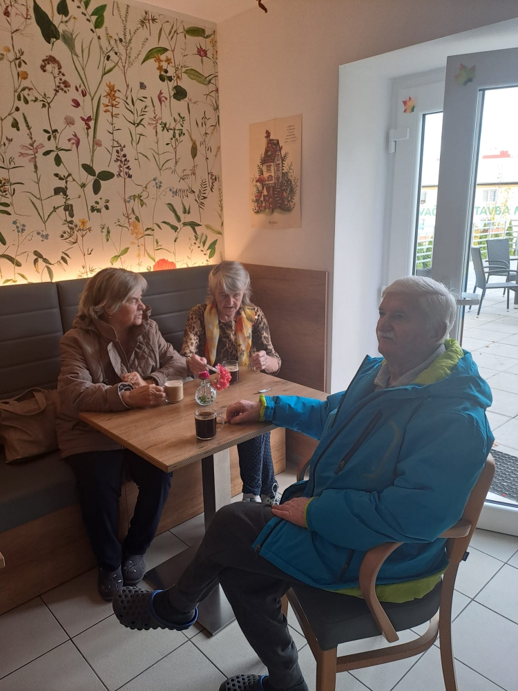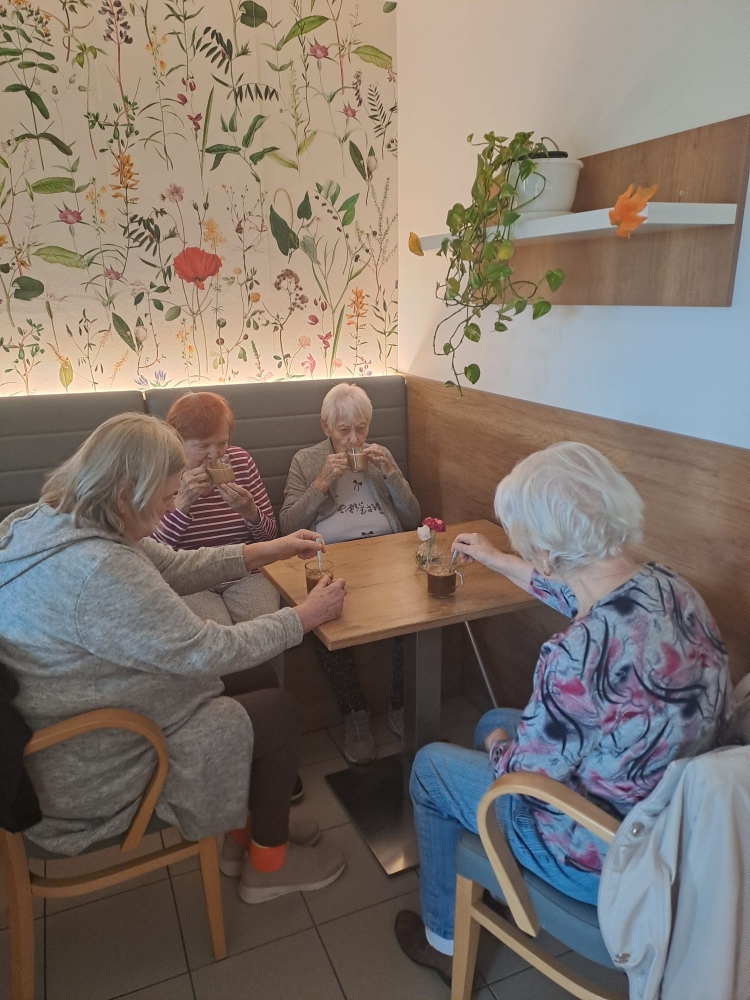 Procházka byla klidná, pomalým tempem a doprovázena klábosením i smíchem. Po delší chvíli strávené chůzí se všichni přesunuli do kavárny, kde na ně čekala voňavá káva. Klienti si mohli vybrat, kávu podle své chuti. V kavárně panovala příjemná, pohodová atmosféra plná historek i vzpomínek ze života všech přítomných klientů.