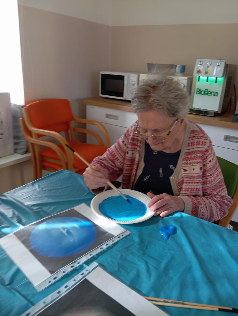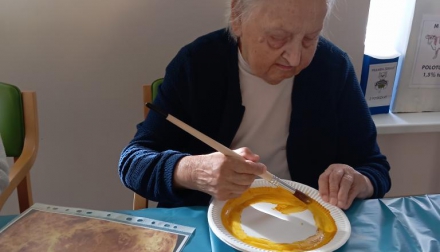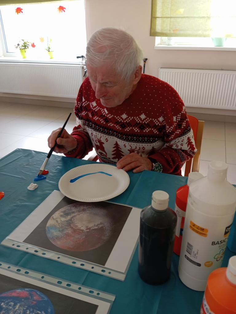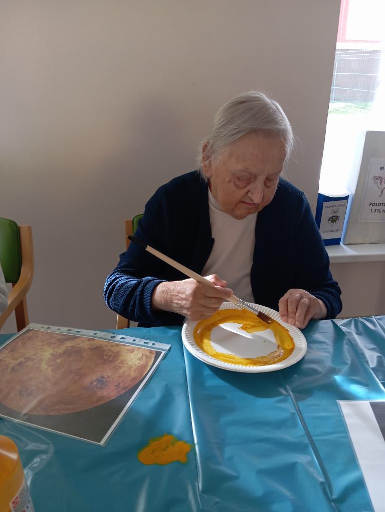 Při malování jsme si povídali o vesmíru, planetách a hvězdách. Klienti si připomněli, kolik planet má naše sluneční soustava a které jsou největší. V místnosti panovala klidná a příjemná atmosféra, plná soustředění a radosti z tvorby. Tvoření pomohlo klientům procvičit jemnou motoriku a podpořilo jejich fantazii. Na závěr jsme si ještě pustili dokument o našem astronautovi. Bylo to veselé a inspirující dopoledne plné barev a úsměvů.