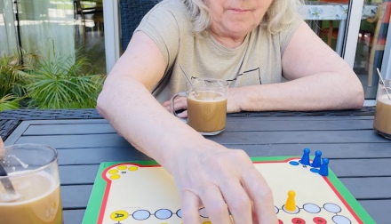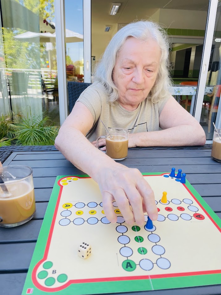 Druhá skupina mezitím soutěžila u stolní hry Člověče, nezlob se, kde se na start často vracely figurky, což vyvolávalo veselé komentáře. Hraní jsme si zpříjemnili šálkem kávy a pořádnou dávkou smíchu.