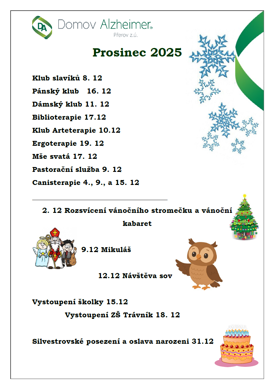 V prosinci nás čeká skutečně bohatý a pestrý program. Zahájíme ho slavnostním rozsvícením vánočního stromu, které doplní naše kabaretní vánoční vystoupení. Následovat bude tradiční mikulášská nadílka a také návštěvy dětí ze škol a školek.
