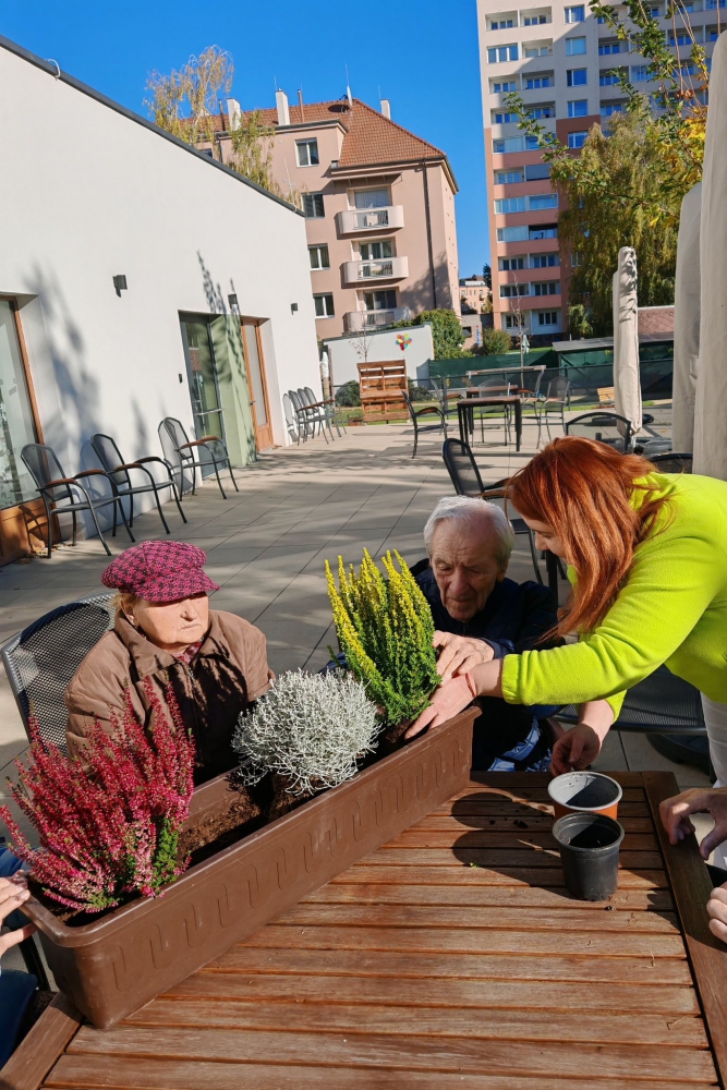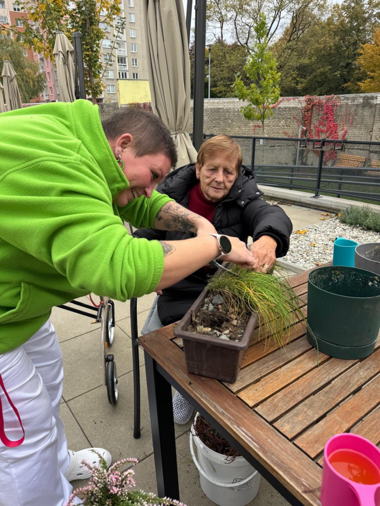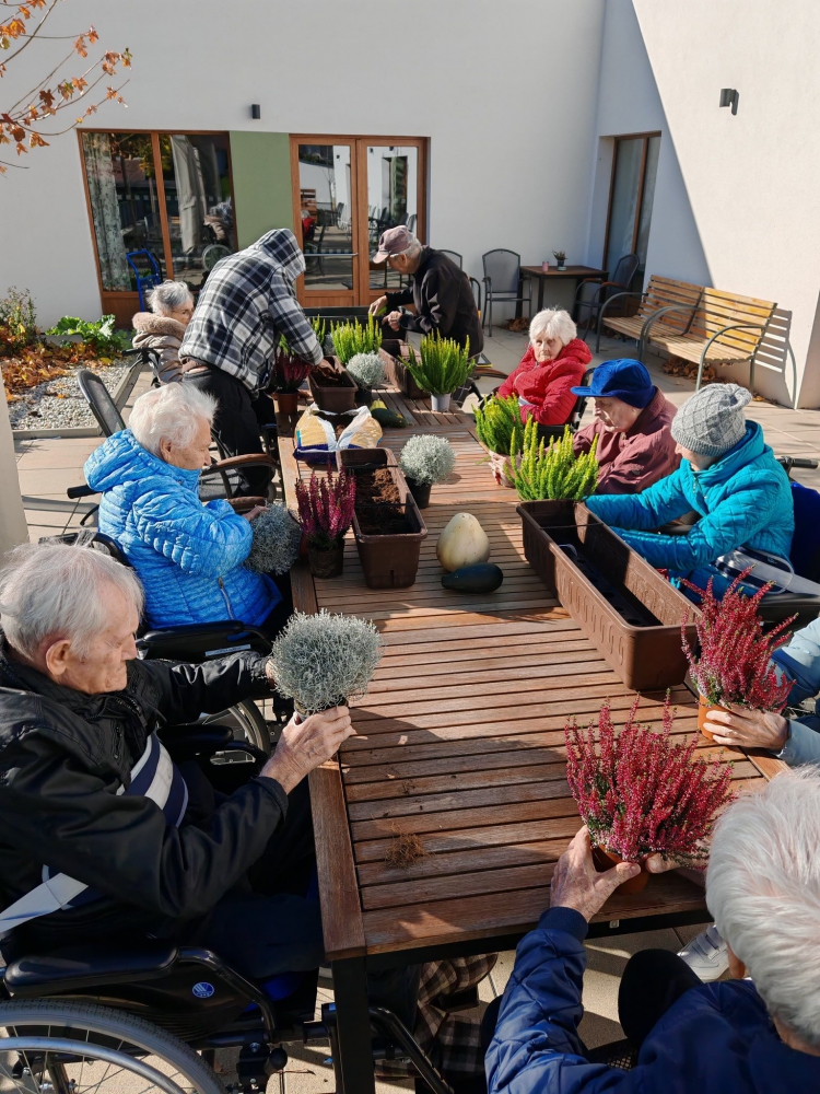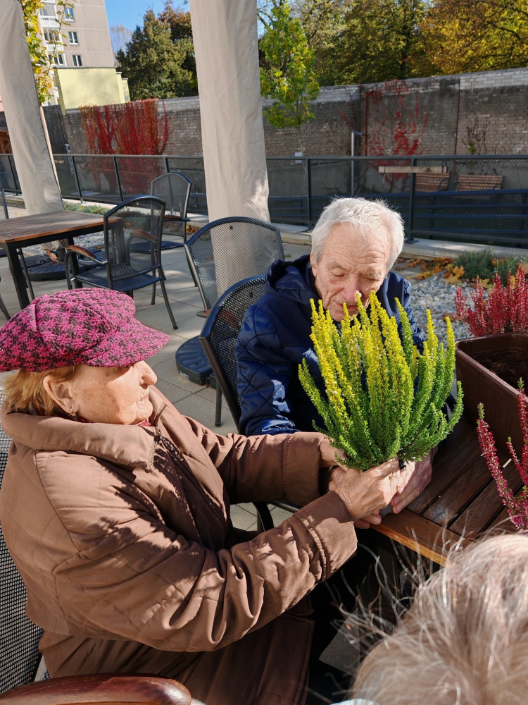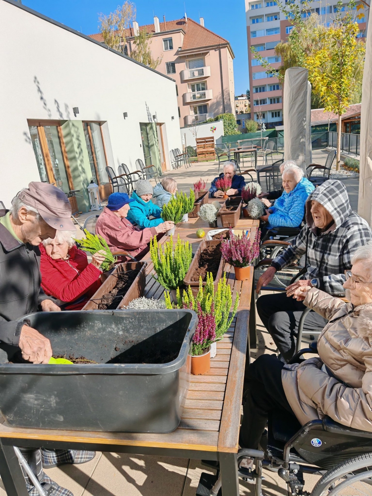 V průběhu týdne jsme se rozhodli obměnit venkovní výzdobu a společně jsme vysadili podzimní truhlíky s vřesy. Klienti si při tom s úsměvem zavzpomínali na své zahrádky a při poslechu slovácké hudby si povídali o tom, co všechno kdysi pěstovali.