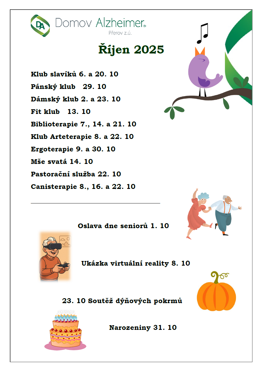 V říjnu se opět máme na co těšit. Začneme tradiční oslavou Dne seniorů, poté nás čeká soutěž mezi jednotlivými patry o nejlepší dýňový pokrm. A to ještě zdaleka není vše – říjnový program bude opravdu nabitý a plný zážitků.