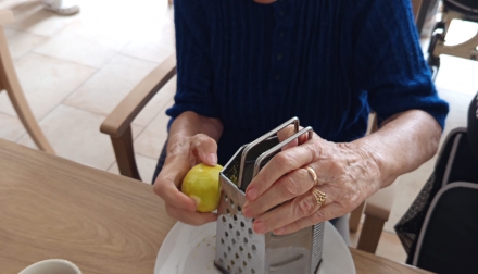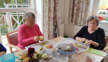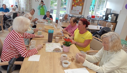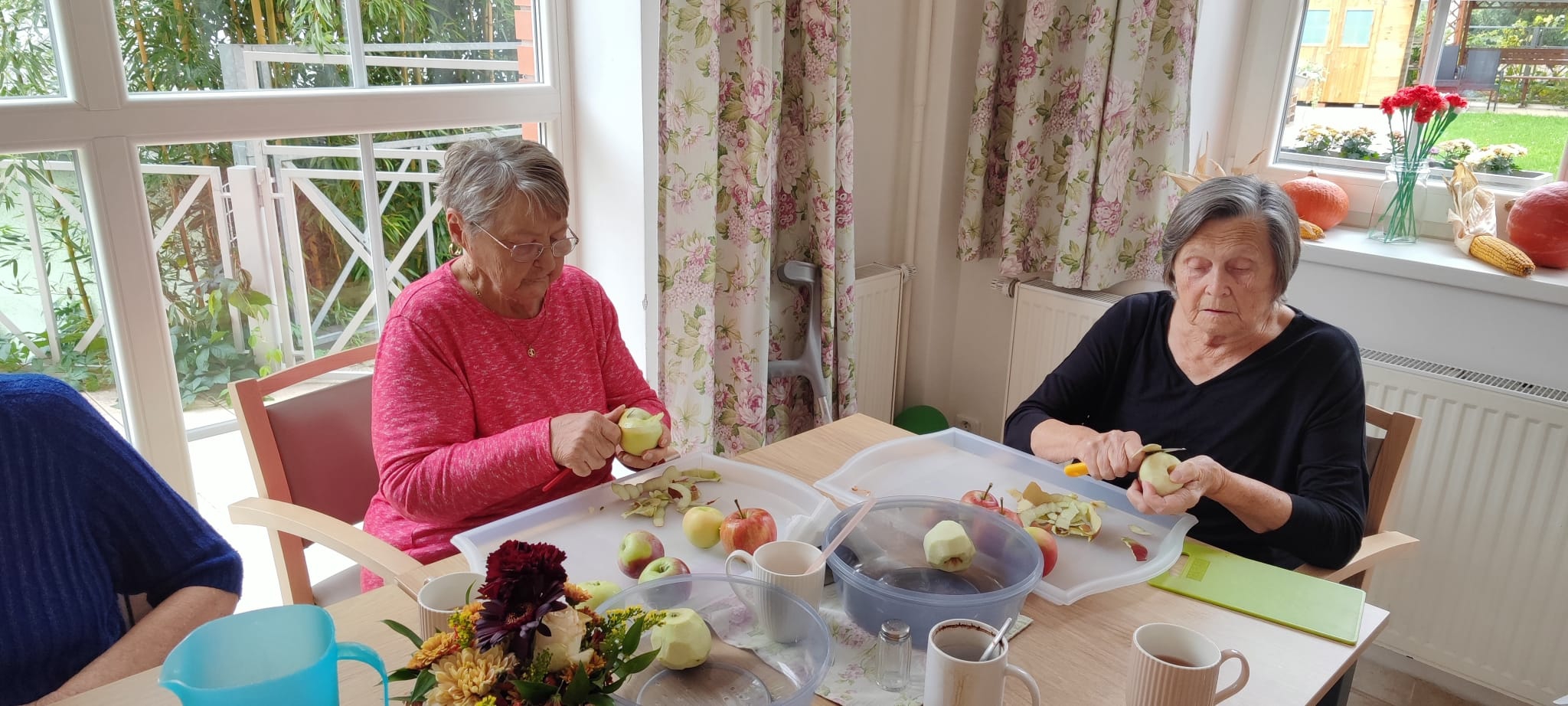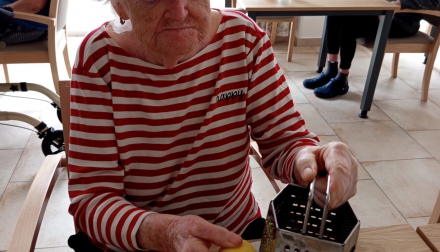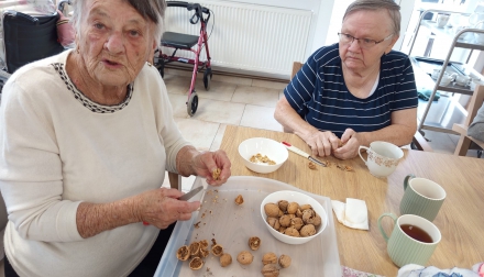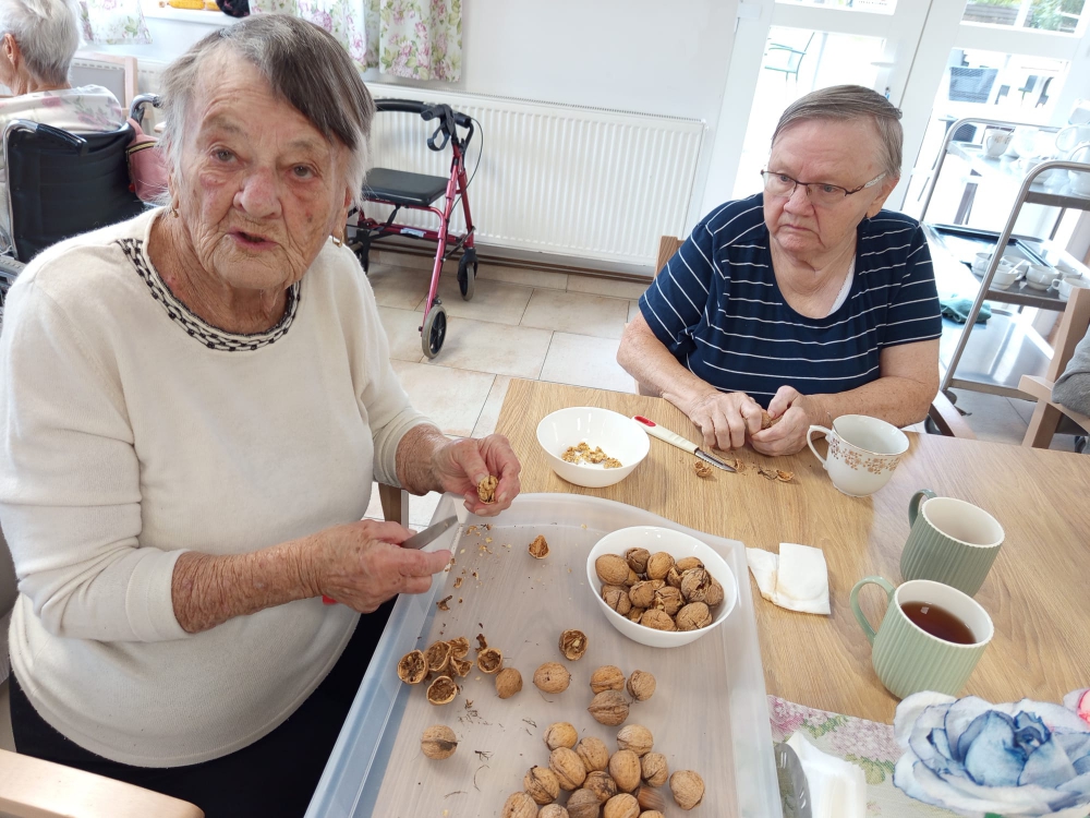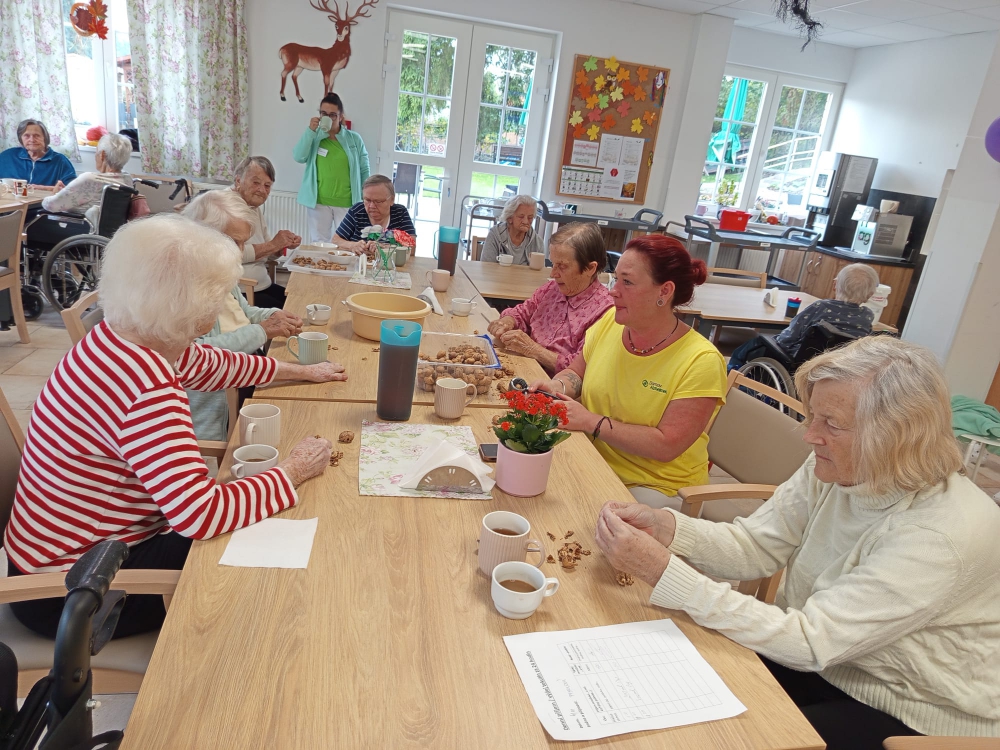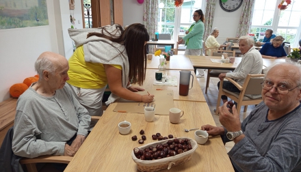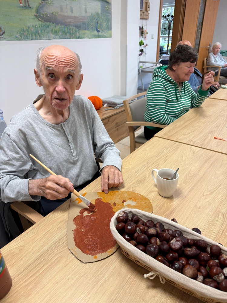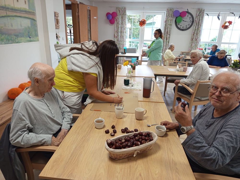 Kaštany se staly nejen krásnou vzpomínkou na dětství, ale i materiálem pro další tvoření. Společně se z nich pak vyráběla podzimní výzdoba – dekorace, které zdobí prostory Domova a pomáhají klientům se zorientovat v ročním období. Stejně tak i loupání ořechů, jablek a pečení výborných zákusků ke kávě. Touto cestou děkujeme rodinným příslušníkům, kteří nám do Domova nosí přebytky ze zahrádky – klienti během aktivizací mají smysluplnou činnost a společně si všichni pochutnají třeba na domácím štrůdlu, který k podzimu neodmyslitelně patří.