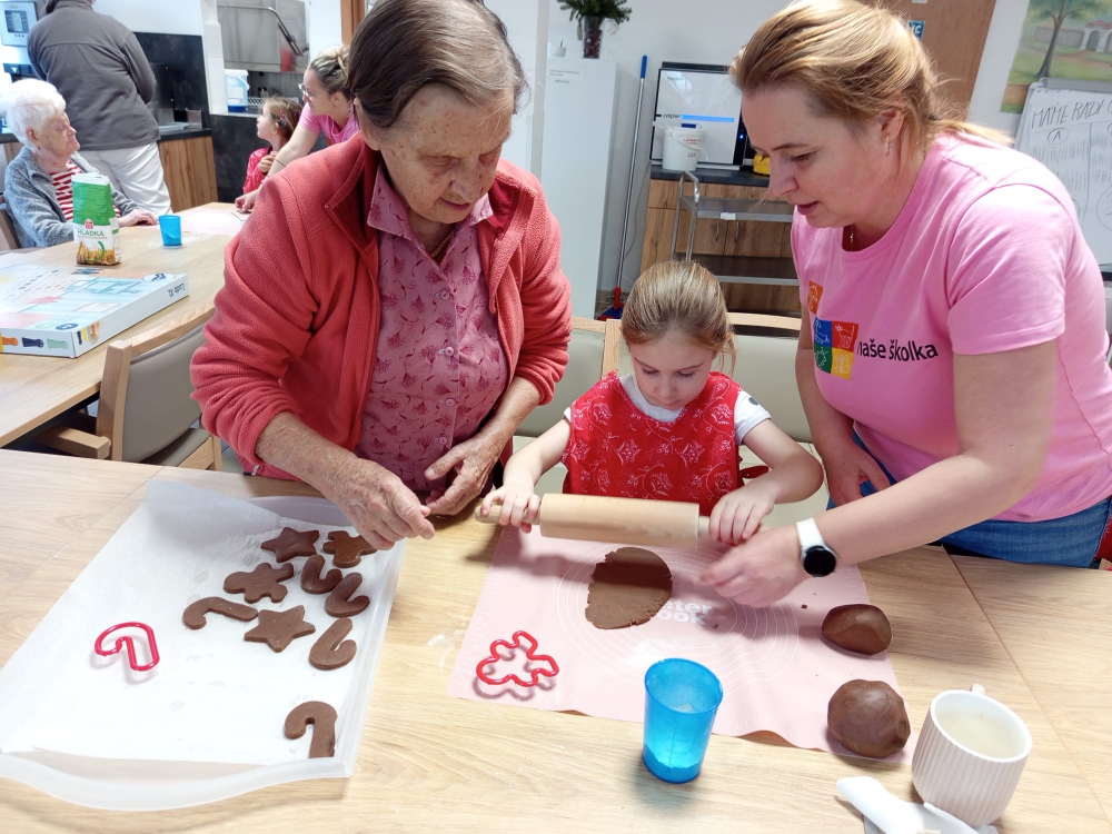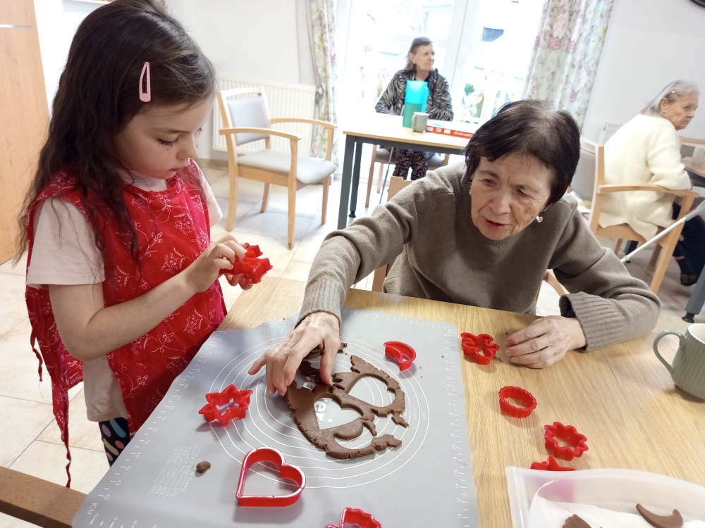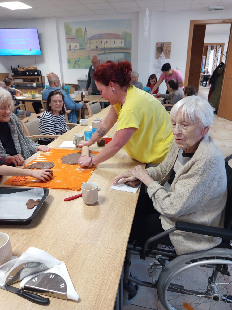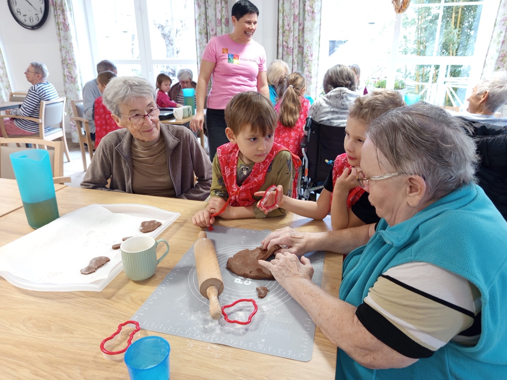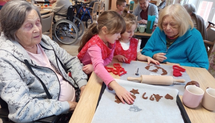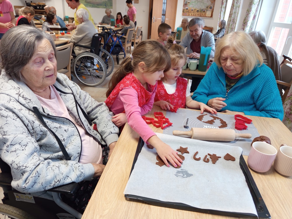 Spojili se totiž s dětmi z mateřské školy, které za námi pravidelně dochází a tentokrát přišly pomoci s pečením perníčků. Společné setkání generací přineslo do Domova mnoho úsměvů a dojemných chvilek. Klienti s velkým nadšením ukazovali dětem, jak se tradiční perníčky připravují, a děti zase přinesly do Domova radost, energii a spoustu zvědavých otázek. Při vykrajování panovala dobrá nálada, klienti i děti pracovali s chutí, povídali si, smáli se a společně tvořili něco, co pro mnohé nese silnou vánoční symboliku. Hotové perníčky budou součástí občerstvení při slavnostním rozsvícení první adventní svíčky.
